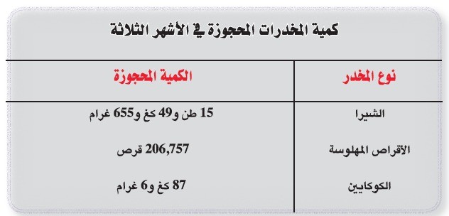 وحسب‭ ‬المعطيات‭ ‬الإحصائية‭ ‬المتوفرة،‭ ‬تمكنت‭ ‬المصالح‭ ‬الأمنية‭ ‬من‭ ‬حجز‭ ‬15‭ ‬طنا‭ ‬و49‭ ‬كيلوغراما‭ ‬من‭ ‬مخدر‭ ‬الشيرا،‭ ‬إضافة‭ ‬إلى‭ ‬87‭ ‬كيلوغراما‭ ‬و6‭ ‬غرامات‭ ‬من‭ ‬الكوكايين،‭ ‬إلى‭ ‬جانب‭ ‬ما‭ ‬مجموعه‭ ‬206‭ ‬آلاف‭ ‬و757‭ ‬قرصا‭ ‬مهلوسا‭. ‬وتشكل‭ ‬هذه‭ ‬الأرقام‭ ‬دليلا‭ ‬على‭ ‬حجم‭ ‬التحديات‭ ‬المرتبطة‭ ‬بمواجهة‭ ‬أنشطة‭ ‬التهريب‭ ‬ومحاولات‭ ‬إدخال‭ ‬المخدرات‭ ‬إلى‭ ‬التراب‭ ‬الوطني‭ ‬أو‭ ‬عبورها‭ ‬نحو‭ ‬الخارج‭.‬