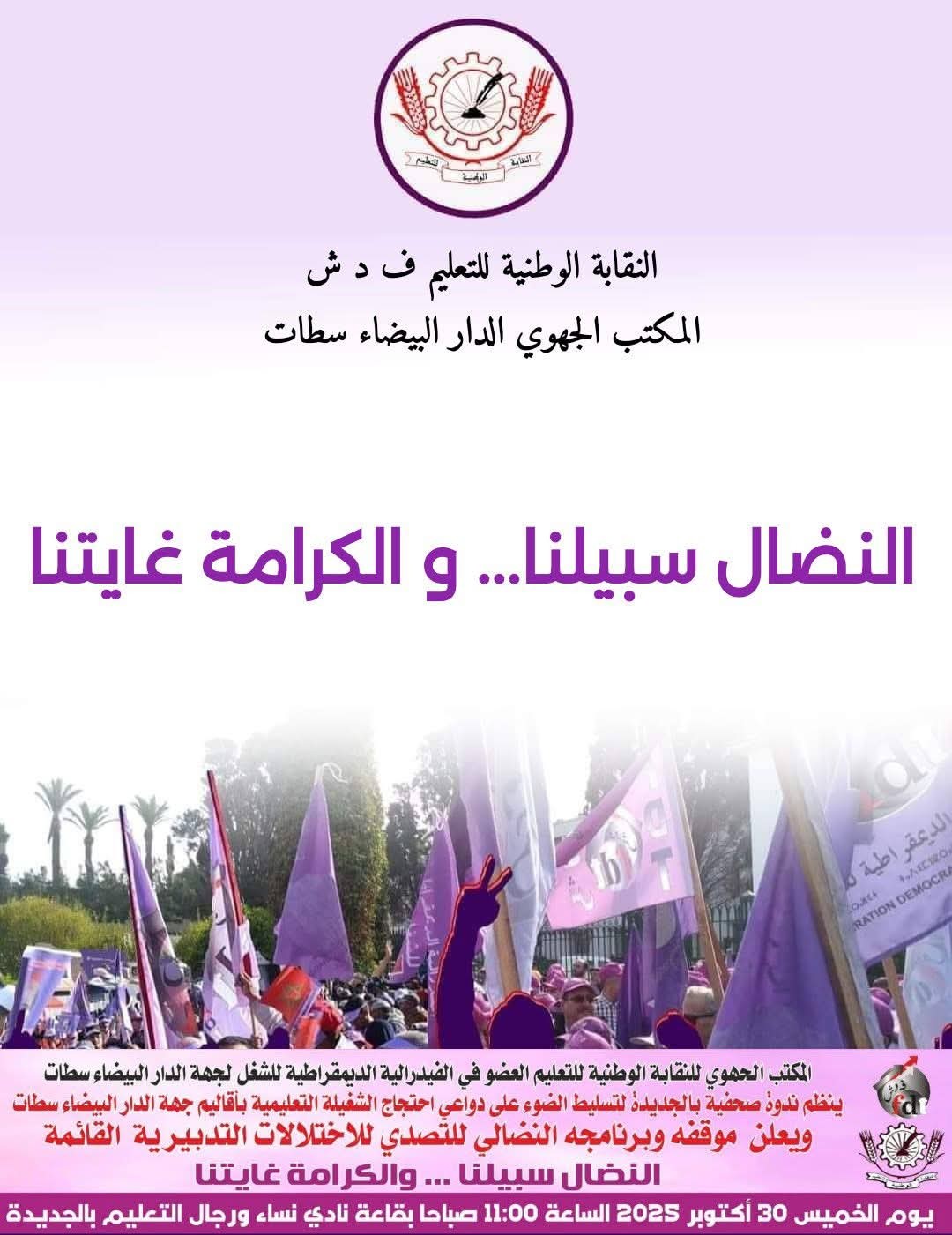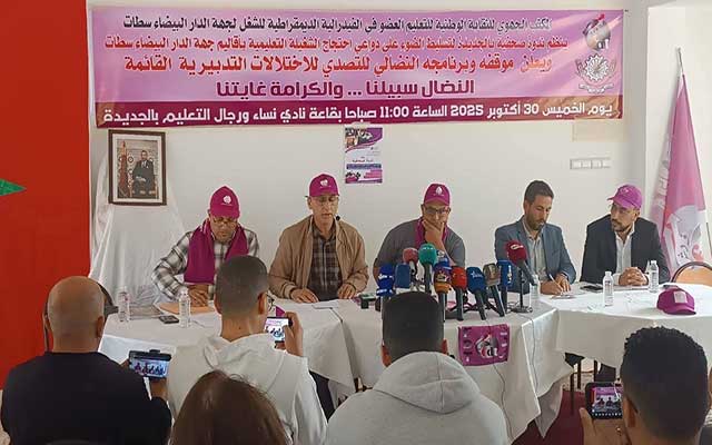 وفي هذا الإطار، نظم المكتب الجهوي للنقابة الوطنية للتعليم (فدش) ندوة صحفية يوم الخميس 30 أكتوبر 2025 بمدينة الجديدة، سلط فيها الضوء على مجموع القضايا والاختلالات التي تعرفها بعض المديريات التابعة للأكاديمية الجهوية، في محاولة لتحريك النقاش العمومي وإطلاع الرأي العام على واقع تدبير الشأن التربوي بالجهة، من منطلق مسؤولية نقابية ومجتمعية.
