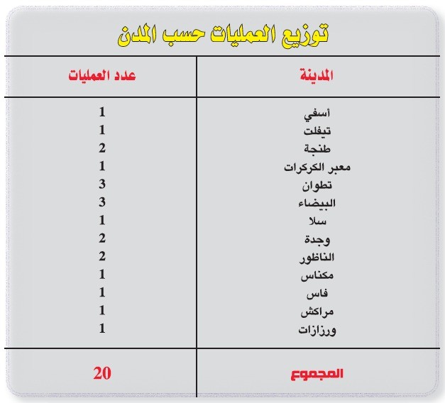 وخلال الفترة الممتدة من أكتوبر 2025 إلى دجنبر 2025، جرى تنفيذ ما مجموعه 18 عملية أمنية نوعية، أسفرت عن توقيف 37 شخصًا يشتبه في ارتباطهم بشبكات تنشط في التهريب والترويج، محليًا ودوليًا. وتوزعت هذه العمليات على عدة مدن ومنافذ حدودية، شملت أسفي، تيفلت، طنجة، معبر الكركرات، تطوان، الدار البيضاء، سلا، وجدة، الناظور، مكناس وفاس، ما يعكس اتساع الرقعة الجغرافية للتدخلات الأمنية.
