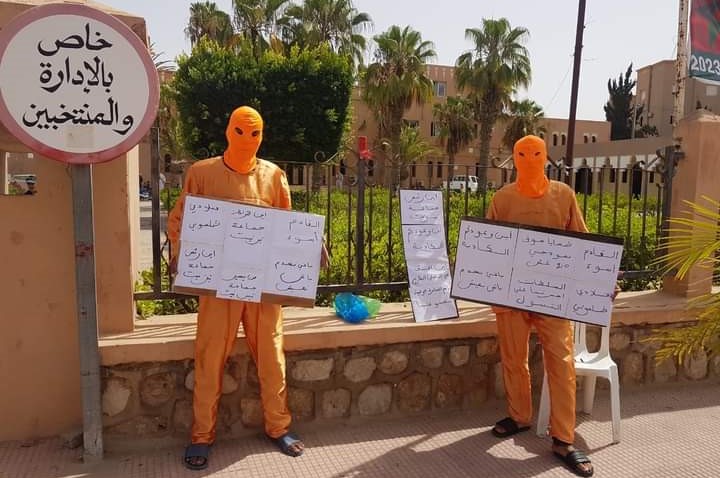 احتج شابان عاطلان عن العمل بطريقة خاصة، وهما يرتديان لباسا برتقاليا، أمام مقر الجماعة الترابية لتيزنيت، على خلفية ما أسماه المحتجان "تملّص المسؤولين من الوعود التي التزموا بها".