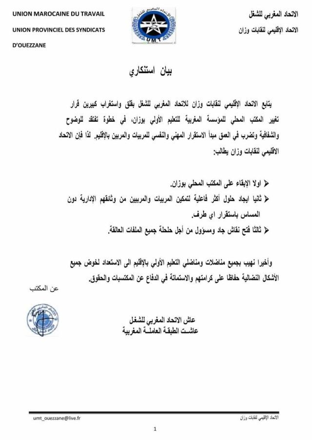 لنزع فتيل التوتر الذي الوطن في غنى عنه، مدخله الأساس ليس غير الحفاظ على استقرار الإطارين الاداريين بمكتب وزان مع توفير شروط حافظة للكرامة تنتهي بالرفع من مردودية المكتب ، وتجويد خدماته.