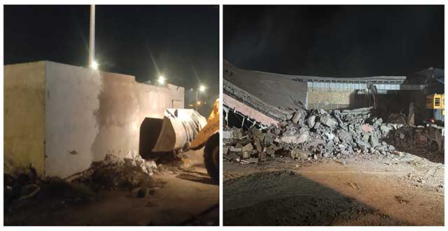 ورغم محاولاته المتكررة لعرقلة تنفيذ القرار، اضطر المعني بالأمر في نهاية المطاف إلى مغادرة سطح المستودعات الذي كان يتحصن به، مما فسح المجال أمام الجرافات لمباشرة عملية الهدم في ظروف مهنية وتحت إشراف لجنة مختصة.