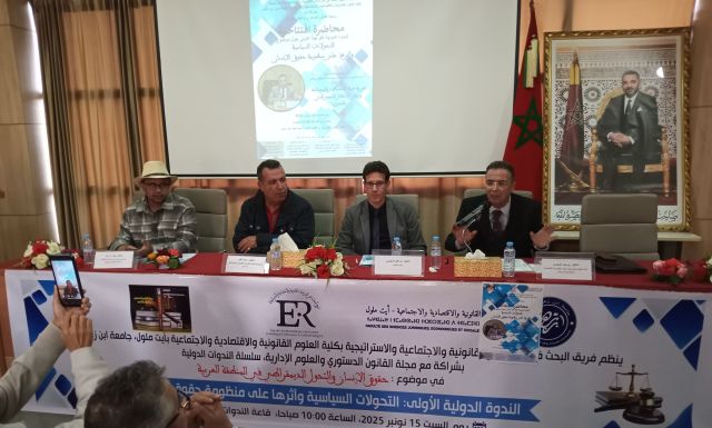 العميد يوسف البحيري (يمينا) وهو يقدم المحاضرة الافتتاحية بكلية ايت ملول، جامعة ابن زهر حول تجربة العدالة الانتقالية بالمغرب نظمت مجموعة البحث في الدراسات القانونية والاجتماعية والاستراتيجية بكلية الحقوق ايت ملول التابعة لجامعة ابن زهر باكادير يوم السبت 15 نونبر 2025 محاضرة افتتاحية في موضوع: تجربة العدالة الانتقالية ورهان الانتقال الديموقراطي بالمغربي. قدمها العميد يوسف البحيري، أستاذ القانون الدولي بكلية الحقوق بمراكش. وذلك على هامش الندوة الدولية حول التحولات السياسية وأثرها على حقوق الإنسان.
