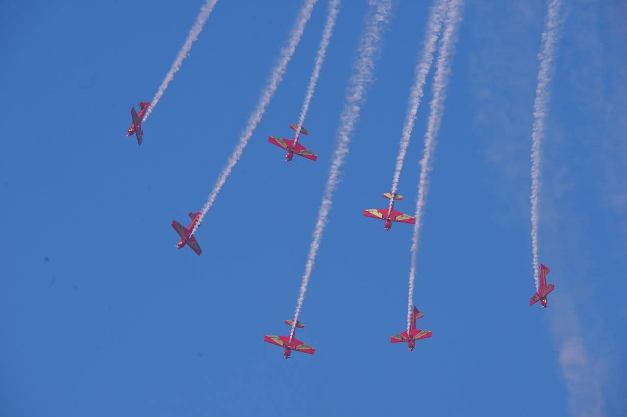 كما قدمت بهذه المناسبة فرقة الطيران الاستعراضي، التابعة للقوات الملكية الجوية “المسيرة الخضراء”، عرضا متميزا تضمن مجموعة من الحركات الفردية والثنائية والجماعية الرائعة اتسمت بالانسجام والتناغم في الأداء. وكانت أبرز لحظة في هذا الاستعراض، قيام فرقة “المسيرة الخضراء” برسم تشكيلات للنجمة الشريفة ونخلة مراكش وكذا لقلبين في السماء يرمزان للعلاقة المتينة التي تجمع بين المملكة المغربية ودولة الإمارات العربية المتحدة.