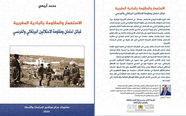 أصدر مركز موكادور للدراسات والأبحاث بدعم من وزارة الثقافة، كتابا جديدا يحمل عنوان "الاستعمار والمقاومة بالبادية المغربية: قبائل إحاحان ومقاومة الاحتلالين البرتغالي والفرنسي" لأستاذ التاريخ المعاصر بجامعة محمد الخامس الرباط محمد أبيهي. ويأتي هذا الإصدار ليملأ فراغا ملحوظا في الكتابات التاريخية الوطنية، خصوصا تلك المتعلقة بمقاومة البوادي للاستعمار بمنطقة جنوب مدينة الصويرة.