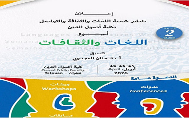 تحتضن كلية أصول الدين بتطوان، التابعة لجامعة عبد المالك السعدي، في الفترة الممتدة من 14 إلى 16 أبريل 2026، فعاليات النسخة الثانية من "أسبوع اللغات والثقافات" ، الذي تنظمه شعبة اللغات والثقافة والتواصل بالكلية.