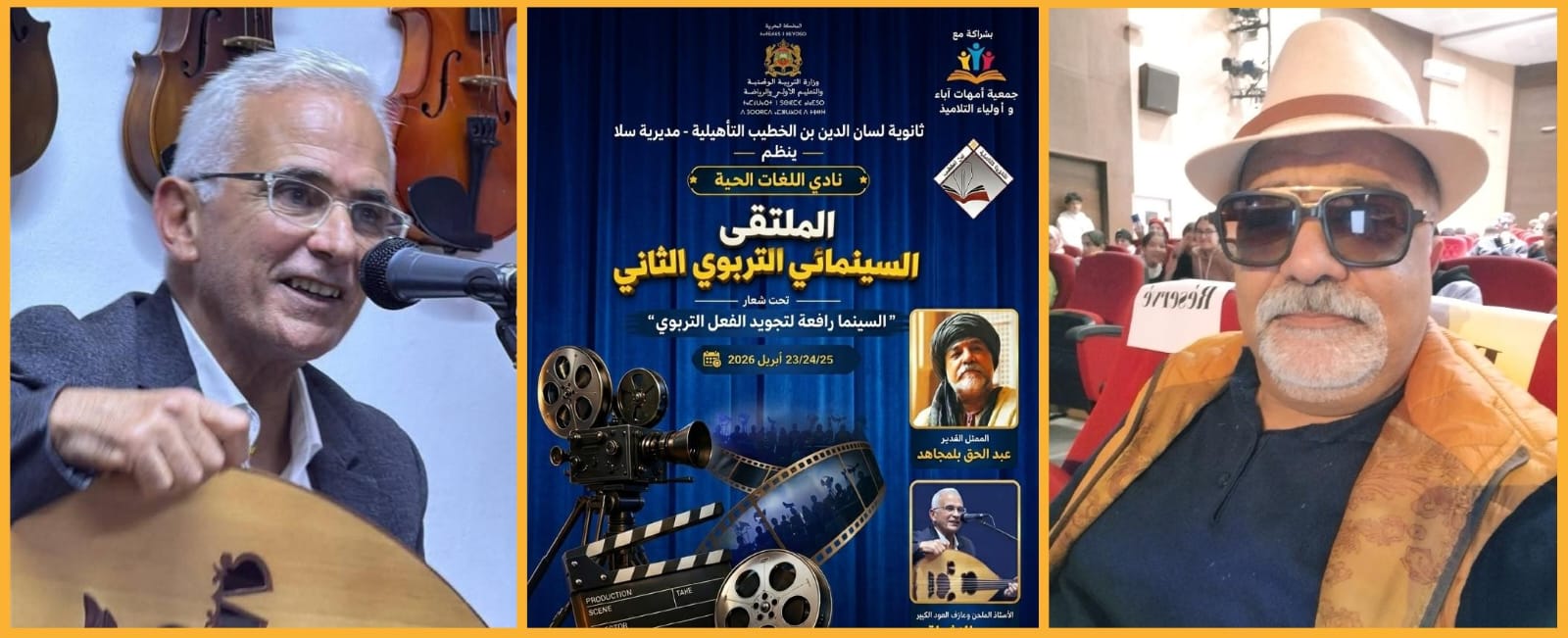 يحل الممثل عبد الحق بلمجاهد والأستاذ الملحن والمطرب عازف آلة العود محمد الأشراقي ضيفان بين صفوف تلامذة ثانوية لسان الدين بن الخطيب التأهيلية ضمن فعاليات " الملتقى السينمائي التربوي الثاني" الذي ينظمه " نادي اللغات الحية" بشراكة مع جمعية أمهات وآباء وأولياء التلاميذ أيام 23، 24 و25 من أبريل الجاري، وتتميز دورة هذه السنة في حضور الفنانين المذكورين، عرض أفلام تربوية مختارة، وتنيظم حلقات مناقشة في حضور أساتذة من مؤطري الأنشطة الثقافية والفنية بالمؤسسة،، تنظيم مائدة مستديرة في محور " الفن والتربية والحياة" تقارب أهمية الثقافة والفنون في بلورة شخصية منفتحة لذى الناشئة، ورشات تكوين فنية وتنويه بتلاميذ مبدعين في رحاب الثانوية، هذا إلى جانب لحظات تتويج ضيفي الملتقى من خلال الإقتراب والاحتفاء بتجربتهما الإبداعية ..