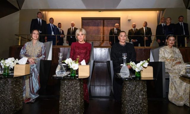 حضرت الأميرات للا خديجة، وللا مريم، وللا حسناء، رفقة بريجيت ماكرون، مساء يوم الأربعاء 22 أبريل 2026، العرض الافتتاحي للمسرح الملكي الرباط، الصرح المعماري الأيقوني الذي يجسد العناية التي ما فتئ الملك محمد السادس، يوليها للفن والثقافة.