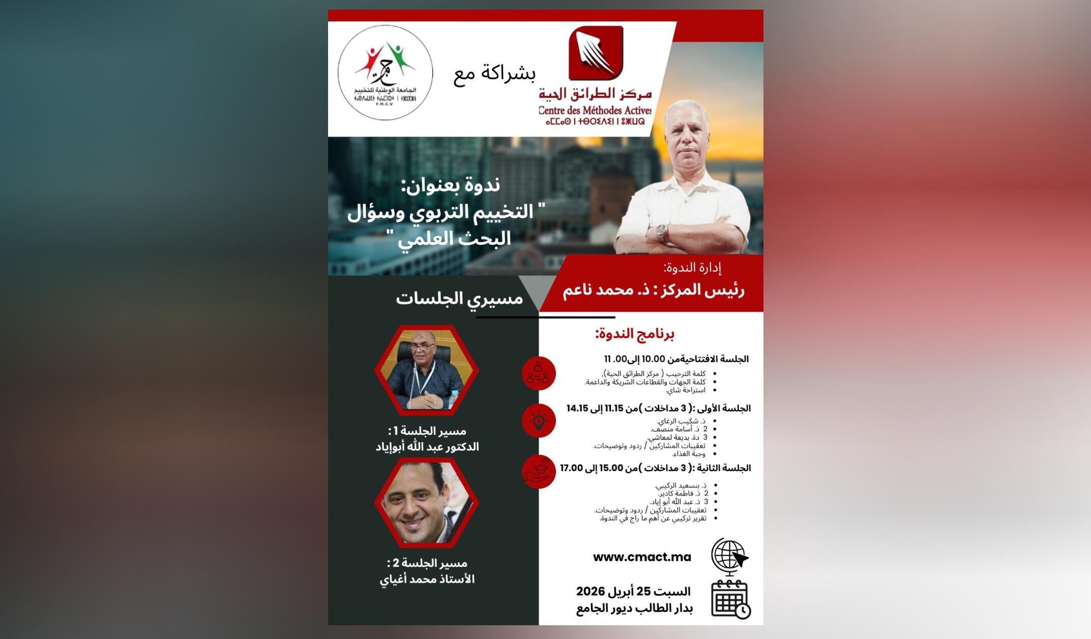 تحتضن قاعة العروض بدار الطالب بديور الجامع بالرباط، يوم الأحد 26 أبريل 2026، ندوة علمية في موضوع “التخييم التربوي وسؤال البحث العلمي”، بمبادرة من مركز الطرائق الحية للتكوين والتنشيط، وبشراكة مع الجامعة الوطنية للتخييم، في لقاء فكري يسعى إلى فتح نقاش نوعي حول موقع التخييم داخل المنظومة التربوية وآفاق تطويره علميا.