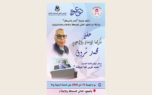تنظم جمعية “نحن والسرطان”، بشراكة مع المعهد العالي للصحافة والإعلام بالدار البيضاء، حفل تقديم وتوقيع كتاب "أحمد فرس كما عرفته عن قرب.. حكايات لم ترو من قبل"، للكاتب الصحافي محمد شروق، وذلك يوم الجمعة 15 ماي 2026 على الساعة الرابعة زوالاً بمقر المعهد.