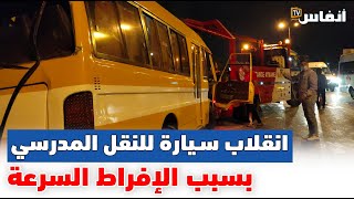 انقلاب سيارة للنقل المدرسي بسبب الإفراط السرعة