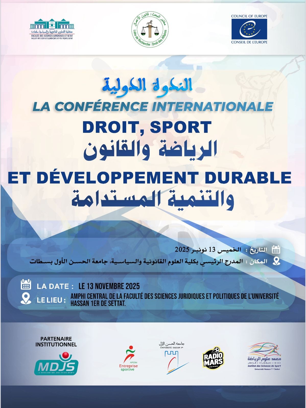 في سياق الاهتمام المتزايد بالدور المتنامي للرياضة كقاطرة للتنمية وأداة لترسيخ القيم الكونية للشفافية والنزاهة والتكافؤ، تنظم جامعة الحسن الأول بسطات، عبر مختبر البحث في قانون الأعمال، ندوة دولية تحت عنوان "القانون والرياضة والتنمية المستدامة"، الخميس 13 نونبر 2025، بكلية الحقوق سطات.