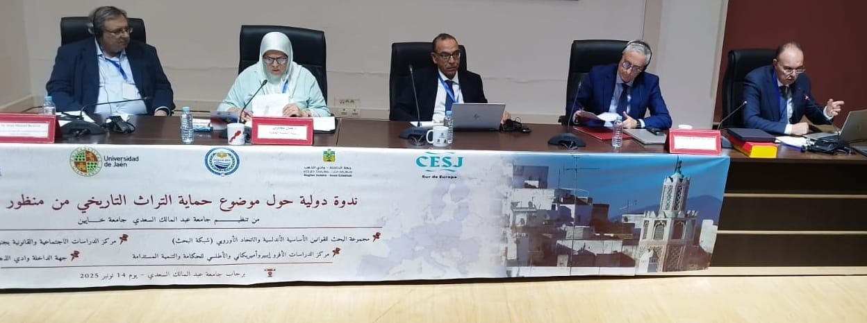 من اليمين إلى اليسار: خيراردو رويس ريكو، عائشة السويد،عبد العزيز رحموني، ناصر الفقيه اللنجري، خوان انطنيو باريلا غونساليس احتضنت قاعة الندوات، برئاسة جامعة عبد الملك السعدي بتطوان يوم الجمعة 14 نونبر2025، أشغال الندوة الدولية حول موضوع "حماية التراث التاريخي من منظور مقارن"، بحضور نخبة من الأكاديميين والباحثين والخبراء المتمرسين بمجال التراث الثقافي بالمغرب وإسبانيا.