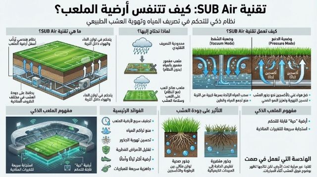 تقنية SUB Air هي نظام متطور يركب أسفل أرضية الملعب، ويهدف إلى التحكم في توازن الهواء والماء داخل التربة. يعتمد هذا النظام على شبكة ذكية من الأنابيب والمجسات، تمكن من إدارة الرطوبة وتهوية الجذور بشكل دقيق، ما يضمن الحفاظ على جودة العشب الطبيعي في أفضل حالاته.