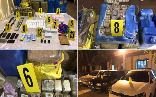 وأضاف البلاغ أن إجراءات البحث أسفرت عن توقيف أربعة أشخاص يشتبه في ارتباطهم بنشاط الشبكة الإجرامية المتورطة في محاولة تهريب هذه الشحنات من المخدرات القوية والمؤثرات العقلية، كما مكنت عمليات التفتيش المنجزة بمنازلهم من ضبط 190 كيلوغراما من مخدر الشيرا وأسلحة بيضاء وثلاث سيارات تحمل لوحات ترقيم أجنبية ووطنية مزورة، وميزان كهربائي، علاوة على مبالغ مالية مهمة يشتبه في كونها من عائدات هذه الأنشطة الإجرامية.