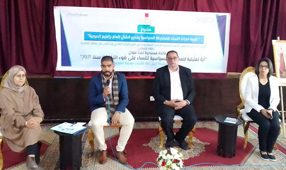 وعرف اللقاء الإفتتاحي ،إلى جانب كلمة مديرة منتدى الفدرياليات الكندي حياة الحبايلي، والورقة التأطيرية للخبير في النوع الاجتماعي خالد سرحان،والخطوط العريضة للمشروع التي قدمها مدير المشروع يوسف أسكور ،- عرف اللقاء- تنظيم مائدة مستديرة مائدة مستديرة حول موضوع: "أية تمثيلية للمشاركة السياسية للنساء على ضوء نتائج انتخابات 08 شتنبر 2021" ،والتي شاركت فيها كل من، سناء زعيمي، رئيسة فدرالية رابطة حقوق النساء بجهة مراكش اسفي، والتي قدمت مداخلة حول موضوع المشاركة السياسية للنساء في المواثيق الدولية والتشريعات الوطنية .وسعاد الديبي، ممثلة جمعية الخير النسوية، في مداخلة حول واقع المشاركة المدنية والسياسية للنساء بإقليم الصويرة. كما قدم عضو اللجنة الجهوية لحقوق الإنسان بجهة مراكش آسفي، والخبير في النوع الإجتماعي الأستاذ خليد سرحان، عرضا حول حصيلة انتخابات 2021 من زاوية النوع الاجتماعي وتمثيلية النساء بالإقليم.