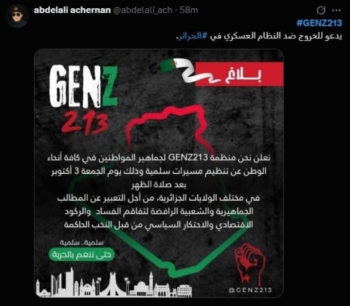 جيل Z، الذي أثبت حضوره القوي في الشارع وعلى المنصات الرقمية، يسعى اليوم إلى إحياء روح الحراك الشعبي الذي عرفته البلاد سنة 2019، لكن بخطاب أكثر حدة ووضوحاً في مواجهة ما يصفونه بـ"الهيمنة المطلقة للجيش".