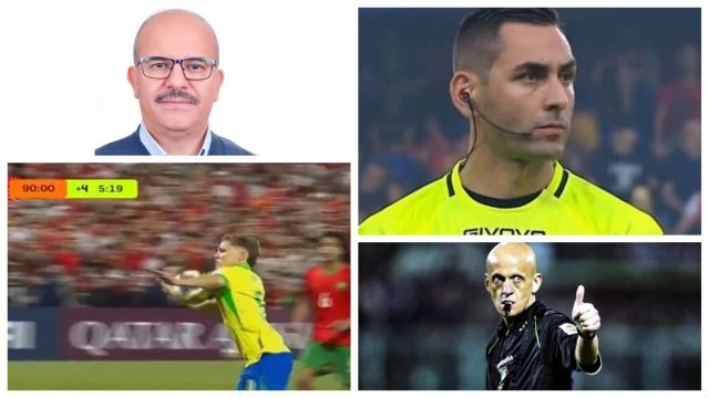لحسن العسبي يراسل الجامعة الايطالية والحكم الدولي كولينا، بعد الفضيحة التحكيمية ضد المنتخب المغربي بكأس العالم قطر لحسن العسبي (يسارا) والحكم "الفضيحة" والحكم الإيطالي الشهير بيير لويجي كولينا ومشهد من المبارة